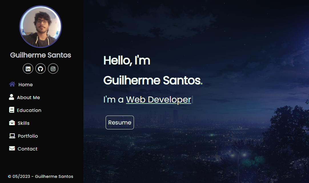Olá! Meu nome é Guilherme, tenho 26 anos, moro em Porto Alegre e sou formado em Análise e Desenvolvimento de Sistemas. No meu tempo livre, gosto de ler livros, caminhar, jogar videogames, sair com os amigos, assistir séries e filmes, estudar e aprender tecnologias/linguagens novas, e codar.